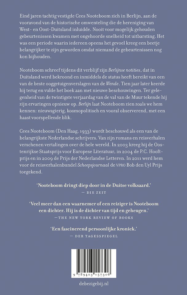 van de beste ooggetuigenverslagen van de Wende. Tien jaar later keerde hij terug en vulde het boek aan met nieuwe beschouwingen. Ter gelegenheid van de twintigste verjaardag van de val van de Muur tekende hij zijn ervaringen opnieuw op. Berlijn laat Nooteboom zien zoals we hem kennen: nieuwsgierig, kosmopolitisch en vooral observerend, met een haast voorspellende blik.