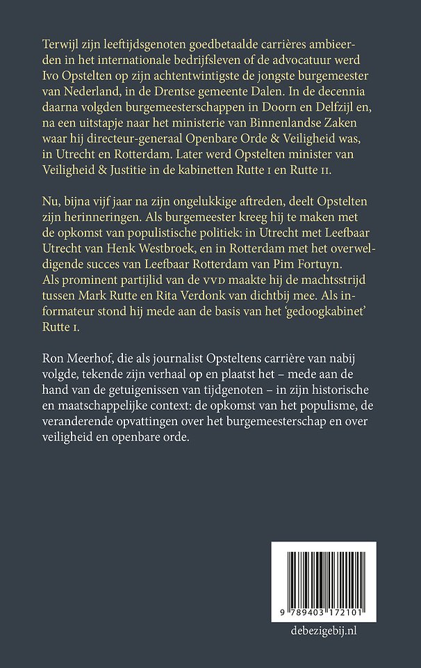 Ron Meerhof, die als journalist Opsteltens carrière van nabij volgde, tekende zijn verhaal op en plaatst het – mede aan de hand van de getuigenissen van tijdgenoten – in zijn historische en maatschappelijke context: de opkomst van het populisme, de veranderende opvattingen over het burgemeesterschap en over veiligheid en openbare orde.