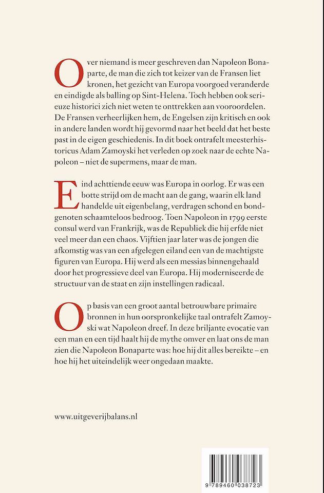 Over niemand is meer geschreven dan Napoleon Bonaparte, de man die zich tot keizer van de Fransen liet kronen, het gezicht van Europa voorgoed veranderde en eindigde als balling op Sint-Helena. Toch hebben ook serieuze historici zich niet weten te onttrekken aan vooroordelen. De Fransen verheerlijken hem, de Engelsen zijn kritisch en ook in andere landen wordt hij gevormd naar het beeld dat het beste past in de eigen geschiedenis. In dit boek ontrafelt meesterhistoricus Adam Zamoyski het verleden op zoek naar de echte Napoleon - niet de supermens, maar de man.