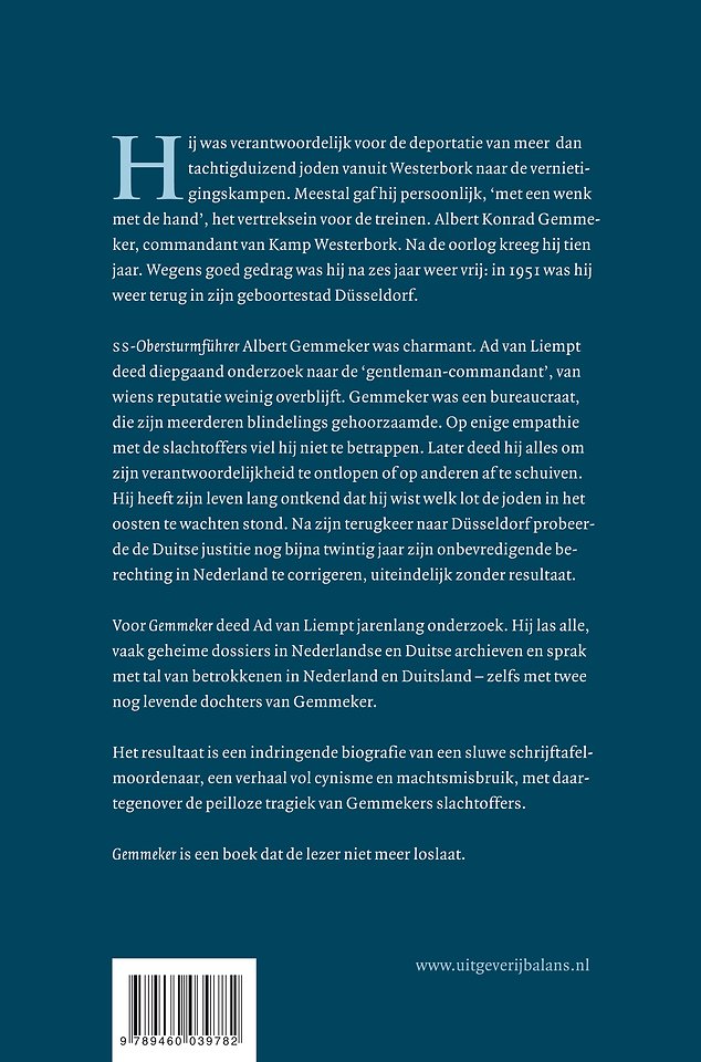 SS-Obersturmführer Albert Gemmeker was charmant. Ad van Liempt deed diepgaand onderzoek naar de ‘gentleman-commandant’, van wiens reputatie weinig overblijft. Gemmeker was een bureaucraat, die zijn meerderen blindelings gehoorzaamde. Op enige empathie met de slachtoffers viel hij niet te betrappen. Later deed hij alles om zijn verantwoordelijkheid te ontlopen of op anderen af te schuiven. Hij heeft zijn leven lang ontkend dat hij wist welk lot de joden in het oosten te wachten stond. Na zijn terugkeer naar Düsseldorf probeerde de Duitse justitie nog bijna twintig jaar zijn onbevredigende berechting in Nederland te corrigeren, uiteindelijk zonder resultaat.