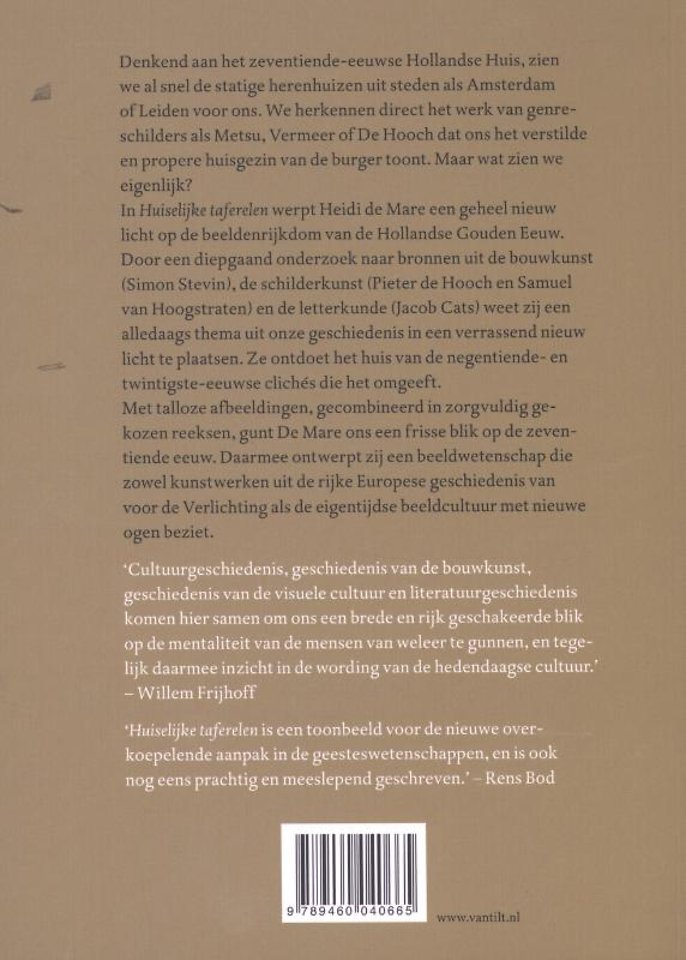 Huiselijke taferelen werpt een geheel nieuw licht op de beeldenrijkdom van de Hollandse Gouden Eeuw. Uitgangspunt is de stelling dat schilderijen, architectuurtekeningen en andere visuele producten een vorm van kennis belichamen. Die kennis is samengebald in de kunst van het bouwen, het schilderen en de poëzie, maar ook in de wijze waarop burgers in de stad samenleefden of hoe men een huwelijk inrichtte. Een diepgaand onderzoek naar de verbeelding van het huiselijk leven in werken van Simon Stevin, Jacob Cats, Pieter de Hooch en Samuel van Hoogstraten legt het fundament voor deze stelling. In al deze kunsten en disciplines is een coherent kennissysteem werkzaam dat berust op de natuurfilosofie van Aristoteles.