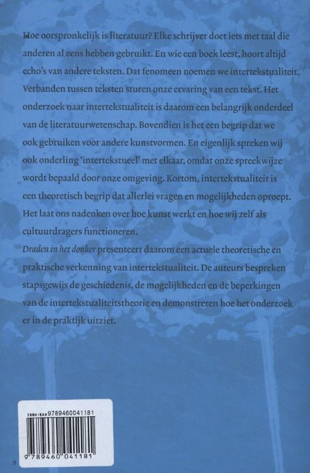 'Draden in het donker' presenteert daarom een actuele theoretische en praktische verkenning van intertekstualiteit. De auteurs (onder wie Maaike Meijer, Ernst van Alphen, Jürgen Pieters en Odile Heynders) bespreken stapsgewijs de geschiedenis, de mogelijkheden en de beperkingen van de intertekstualiteitstheorie en demonstreren hoe het onderzoek er in de praktijk uitziet.