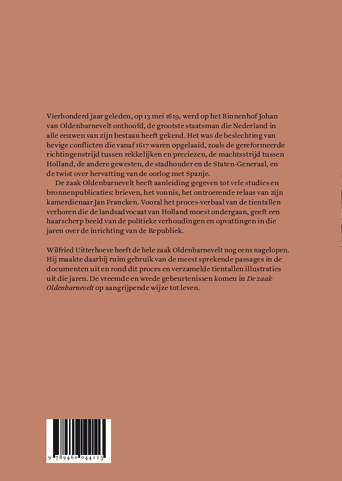 De zaak Oldenbarnevelt heeft aanleiding gegeven tot vele, soms heel polemische studies en tal van bronnenpublicaties: brieven, het vonnis, het ontroerende relaas van zijn kamerdienaar Jan Francken. Vooral het proces-verbaal van de tientallen verhoren die de landsadvocaat van Holland tijdens zijn gevangenschap moest ondergaan, geeft een haarscherp beeld van de politieke verhoudingen en opvattingen in die jaren over de inrichting van de Republiek. De historicus en jurist Wilfried Uitterhoeve heeft de hele zaak Oldenbarnevelt nog eens nagelopen, van voorgeschiedenis tot naweeën. Hij heeft daarbij een ruim gebruikgemaakt van de meest sprekende passages in de documenten uit en rond dit proces en verzamelde vele tientallen illustraties uit die jaren. De vreemde en wrede gebeurtenissen van 1619 komen in De zaak Oldenbarnevelt pijnlijk tot leven voor de lezers van nu.