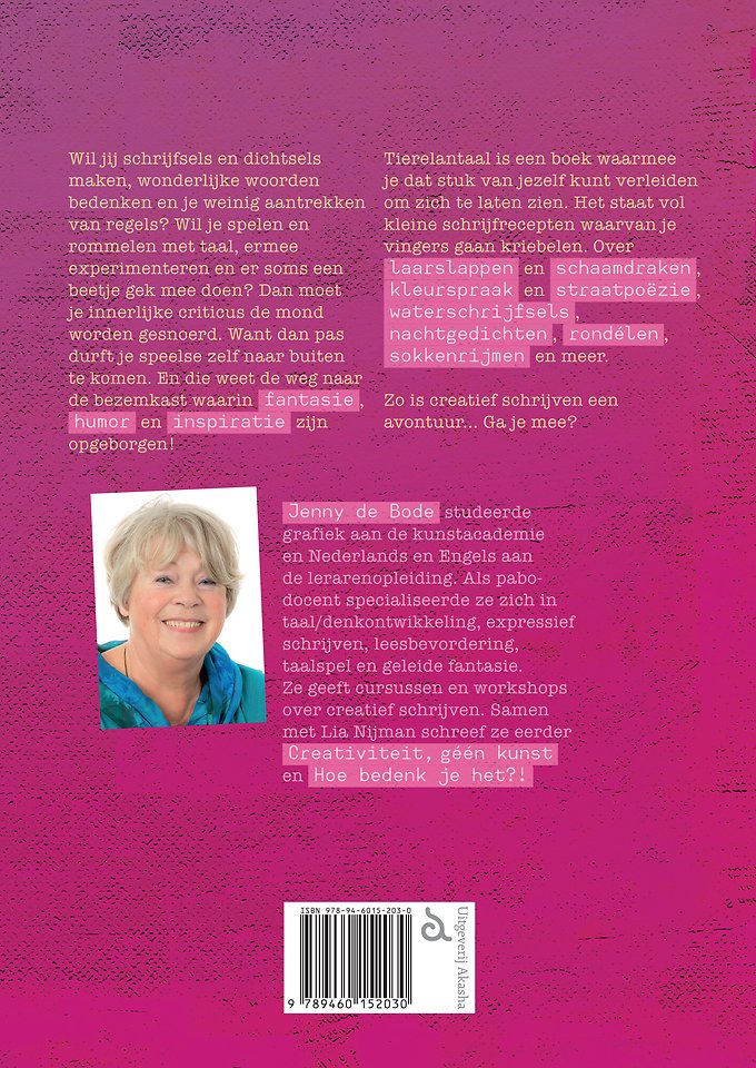 'Tierelantaal' is een boek waarmee je dat stuk van jezelf kunt verleiden om zich te laten zien. Het staat vol kleine schrijfrecepten waarvan je vingers gaan kriebelen. Over laarslappen en schaamdraken, kleurspraak en straatpoëzie, waterschrijfsels, nachtgedichten, rondélen, sokkenrijmen en meer.
