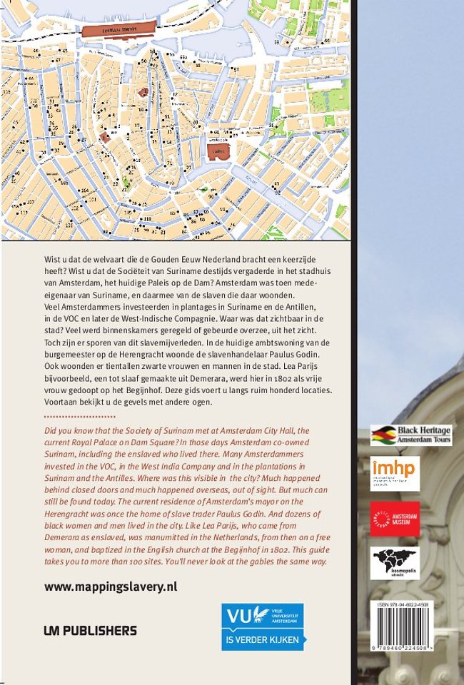 Wist u dat de welvaart die de Gouden Eeuw Nederland bracht een keerzijde heeft? Wist u dat de Sociëteit van Suriname destijds vergaderde in het stadhuis van Amsterdam, het huidige Paleis op de Dam? Amsterdam was toen medeeigenaar van Suriname, en daarmee van de slaven die daar woonden. Veel Amsterdammers investeerden in plantages in Suriname en de Antillen, in de VOC en later de West-Indische Compagnie. Waar was dat zichtbaar in de stad? Veel werd binnenskamers geregeld of gebeurde overzee, uit het zicht. Toch zijn er sporen van dit slavernijverleden. In de huidige ambtswoning van de burgemeester op de Herengracht woonde de slavenhandelaar Paulus Godin. Ook woonden er tientallen zwarte vrouwen en mannen in de stad. Lea Parijs bijvoorbeeld, een tot slaaf gemaakte uit Demerara, werd hier in 1802 als vrije vrouw gedoopt op het Begijnhof. Deze gids voert u langs ruim honderd locaties. Voortaan bekijkt u de gevels met andere ogen.