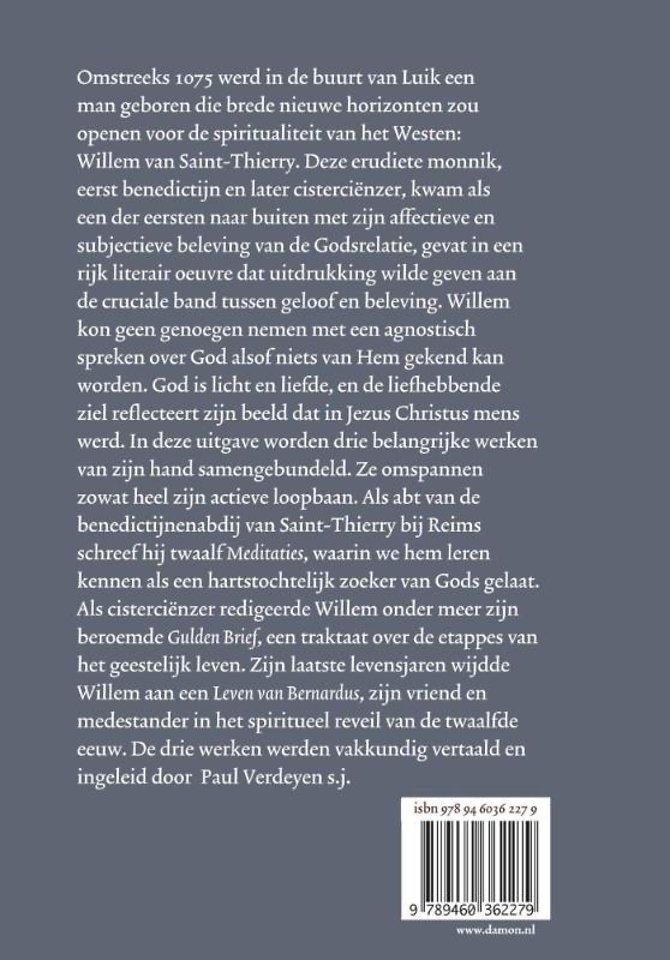 Omstreeks 1075 werd in de buurt van Luik een man geboren die brede nieuwe horizonten zou openen voor de spiritualiteit van het Westen: Willem van Saint-Thierry. Deze erudiete monnik, eerst benedictijn en later cisterciënzer, kwam als een der eersten naar buiten met zijn affectieve en subjectieve beleving van de Godsrelatie, gevat in een rijk literair oeuvre dat uitdrukking wilde geven aan de cruciale band tussen geloof en beleving. Willem kon geen genoegen nemen met een agnostisch spreken over God alsof niets van Hem gekend kan worden. God is licht en liefde, en de liefhebbende ziel reflecteert zijn beeld dat in Jezus Christus mens werd. In deze uitgave worden drie belangrijke werken van zijn hand samengebundeld. Ze omspannen zowat heel zijn actieve loopbaan. Als abt van de benedictijnenabdij van Saint-Thierry bij Reims schreef hij twaalf 'Meditaties', waarin we hem leren kennen als een hartstochtelijk zoeker van Gods gelaat. Als cisterciënzer redigeerde Willem onder meer zijn beroemde'Gulden Brief', een traktaat over de etappes van het geestelijk leven. Zijn laatste levensjaren wijdde Willem aan een 'Leven van Bernardus', zijn vriend en medestander in het spiritueel reveil van de twaalfde eeuw. De drie werken werden vakkundig vertaald en ingeleid door Paul Verdeyen s.j.