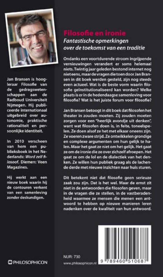 Jan Bransen betoogt in dit boek dat filosofen het theater in zouden moeten. Zij zouden moeten zorgen voor een "heerlijk avondje uit denken", want wat filosofen doen is, in feite, toneelspelen. Ze doen alsof ze het met elkaar oneens zijn. Ze voeren zware strijd. Ze ontwikkelen grondige en complexe argumenten om hun gelijk te halen. Maar het gaat ze niet om het gelijk. Het gaat ze om de ironie die ze over zichzelf afroepen. Het gaat ze om de lol en de dialectiek van het denken. Ze willen hun publiek graag als de lachende derde met nieuwe inzichten naar huis sturen.