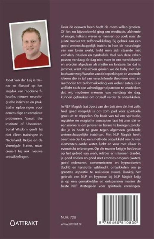 In NLP Magick laat Joost van der Leij zien dat het zelfs heel goed mogelijk is om zo"n pad voor spirituele groei uit te stippelen. Op basis van tal van spirituele, mystieke en magische concepten laat hij zien dat er een manier is om je leven in balans te brengen zonder dat je in hoeft te gaan tegen algemeen geldende wetenschappelijke inzichten. Met NLP Magick heeft Joost van der Leij een methode ontwikkeld om de vier elementen, aarde, water, lucht en vuur met elkaar in evenwicht te brengen. Op die manier krijg je het beste op het gebied van werk, relaties en inkomen (aarde), je goed voelen en goed met emoties omgaan (water), goed redeneren, communiceren en hypnotiseren (lucht) en tenslotte wilskracht ontwikkelen om je grootste aspiratie te realiseren (vuur). Dankzij het gebruik van NLP en hypnose bij NLP Magick krijg je op een gemakkelijke en ontspannen manier de beste NLP strategieën voor spirituele ervaringen.