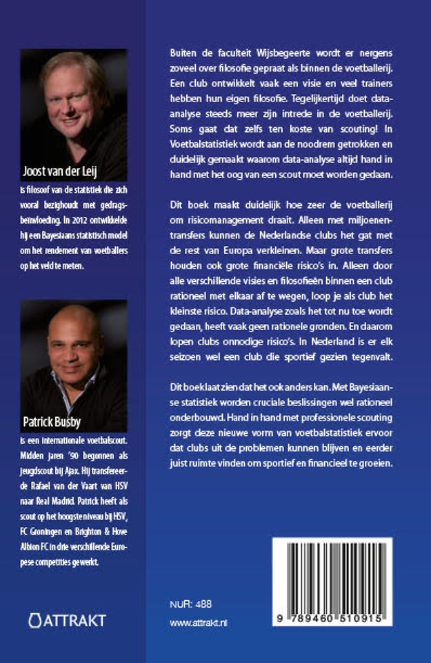 Dit boek laat zien dat het ook anders kan. Met Bayesiaanse statistiek worden cruciale beslissingen wel rationeel onderbouwd. Hand in hand met professionele scouting zorgt deze nieuwe vorm van voetbalstatistiek ervoor dat clubs uit de problemen kunnen blijven en eerder juist ruimte vinden om sportief en financieel te groeien.