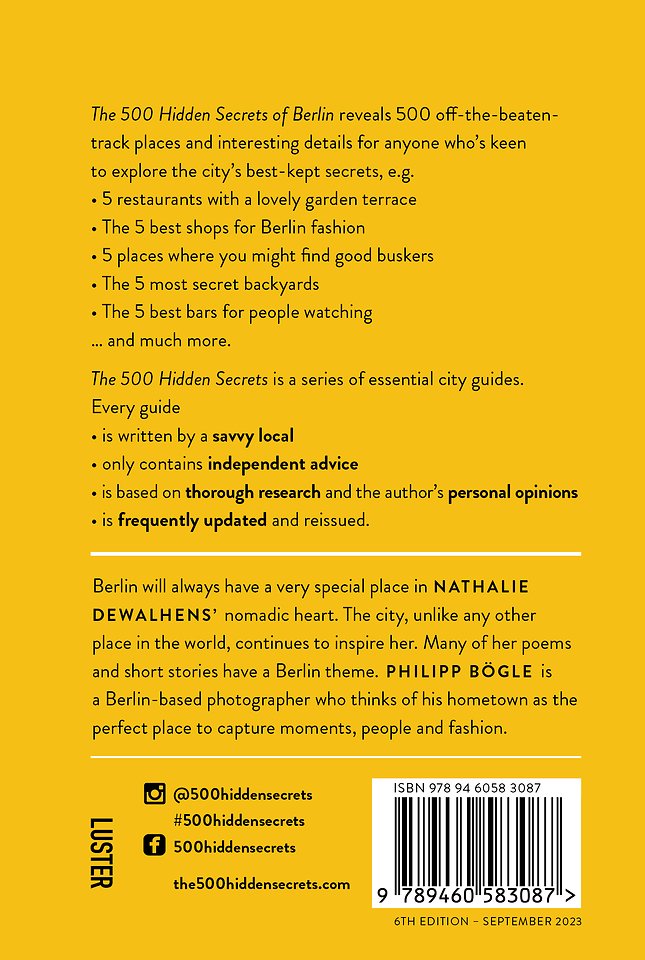 The 500 Hidden Secrets of Berlin is the perfect book for those who wish to discover the city without ending up in all the usual tourist haunts, as well as for residents who are keen to track down the city's best-kept secrets. In The 500 Hidden Secrets of Berlin, Nathalie Dewalhens shares hundreds of must-know addresses in the German capital, like the unexpected authentic coffee bar around the corner of Checkpoint Charlie, or the apartment where David Bowie stayed while composing some of his best songs. Or how about trying a pizza topped with purple potato crisps at one of the hippest pizzerias in town? Visit the boutique of an unconventional fashion designer with Iranian roots, or venture off to a peaceful lake outside the city, where you can enjoy a drink sitting on the wooden boardwalk, or check out a hip food market on the banks of the Spree? Berlin has so much to offer, and this guide will help you decide where to begin.
