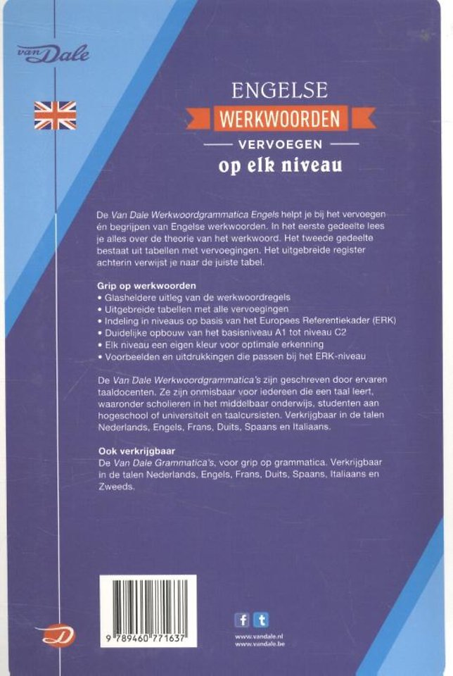 De Van Dale Werkwoordgrammatica Engels helpt je bij het vervoegen én begrijpen van Engelse werkwoorden. In het eerste gedeelte lees je alles over de theorie van het werkwoord. Het tweede gedeelte bestaat uit tabellen met vervoegingen. Het uitgebreide register achterin verwijst je naar de juiste tabel.