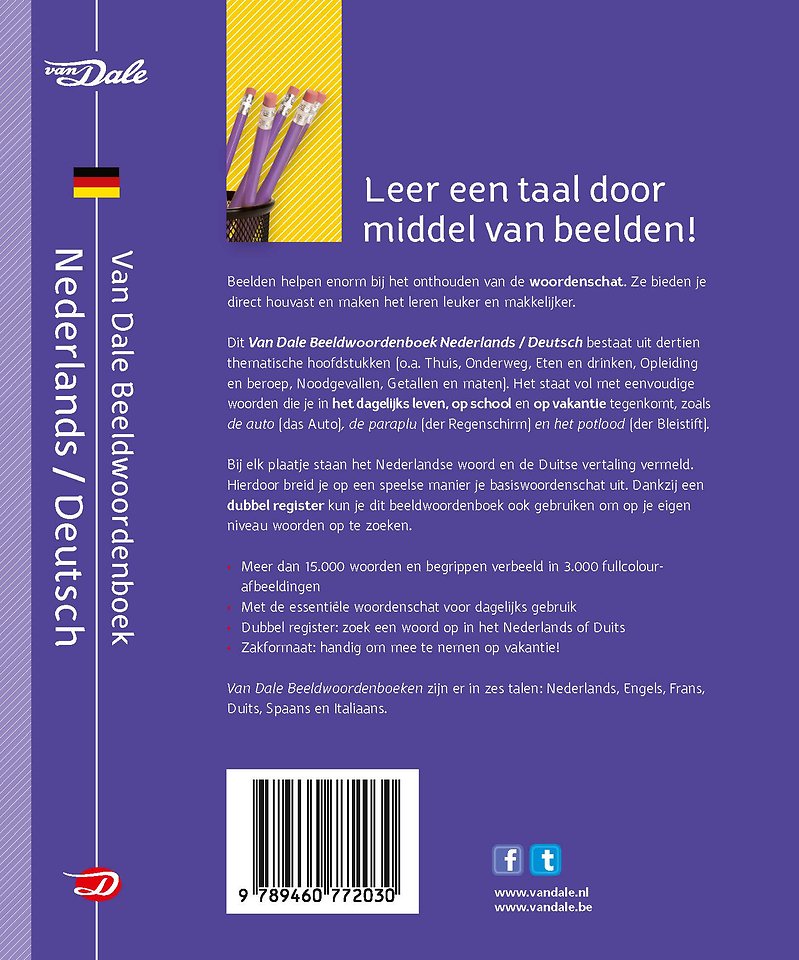 Bij elk plaatje staan het Nederlandse woord en de Duitse vertaling vermeld. Hierdoor breid je op een speelse manier je basiswoordenschat uit. Dankzij een dubbel register kun je dit beeldwoordenboek ook gebruiken om op je eigen niveau woorden op te zoeken.