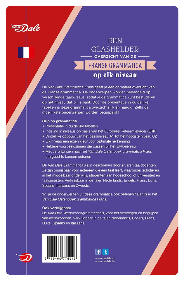 De Van Dale Grammatica Frans geeft je een compleet overzicht van de Franse grammatica. De onderwerpen worden behandeld op verschillende taalniveaus, zodat je de grammatica kunt bestuderen op het niveau dat bij je past. Door de presentatie in duidelijke tabellen is deze grammatica overzichtelijk en handig. Zelfs de moeilijkste onderwerpen worden begrijpelijk!