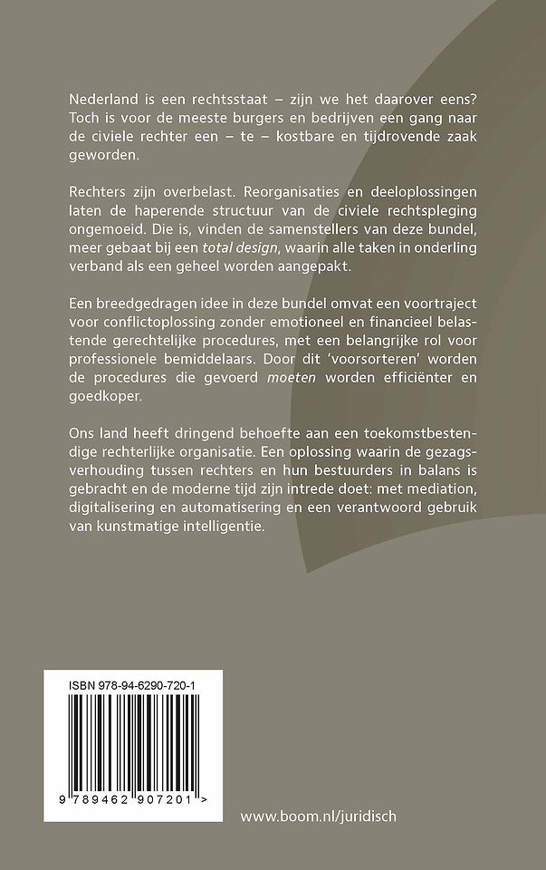 Rechters zijn overbelast. Reorganisaties en deeloplossingen laten de haperende structuur van de civiele rechtspleging ongemoeid. Die is, vinden de samenstellers van deze bundel, meer gebaat bij een total design, waarin alle taken in onderling verband als een geheel worden aangepakt.