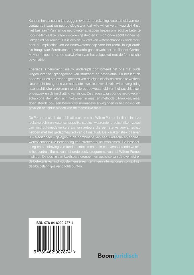 Kunnen hersenscans iets zeggen over de toerekeningsvatbaarheid van een verdachte? Laat de neurobiologie zien dat vrije wil en verantwoordelijkheid niet bestaan? Kunnen de neurowetenschappen helpen om recidive beter te voorspellen? Deze vragen worden gesteld en kritisch onderzocht binnen het vakgebied neurorecht. Dit is een nieuw veld van wetenschappelijk onderzoek naar de implicaties van de neurowetenschap voor het recht. In zijn oratie als hoogleraar Forensische psychiatrie gaat psychiater en filosoof Gerben Meynen dieper in op de raakvlakken van het vakgebied met de forensische psychiatrie.