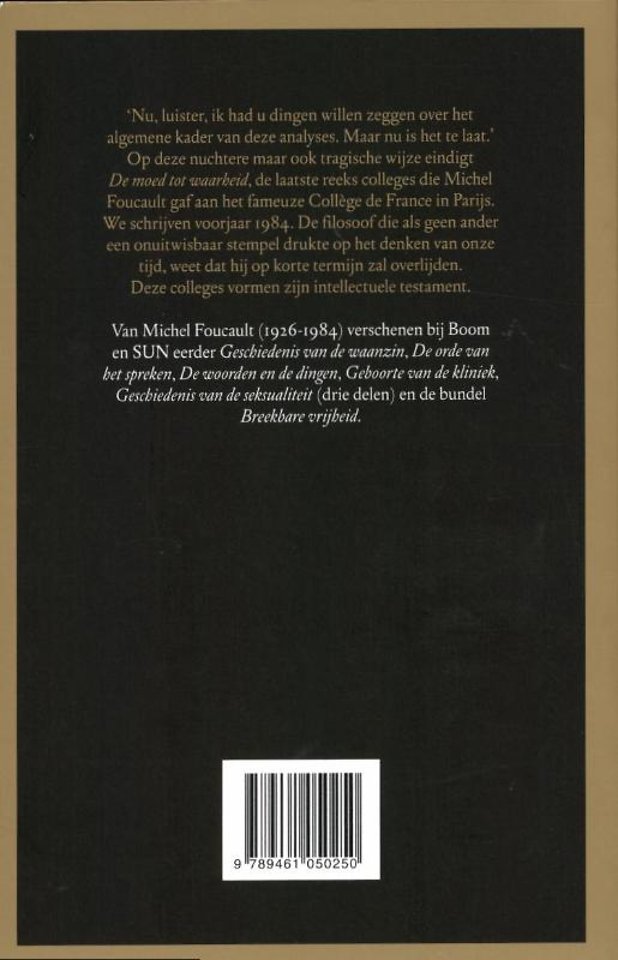 ‘Nu, luister, ik had u dingen willen zeggen over het algemene kader van deze analyses. Maar nu het is te laat.’ Op deze tragische wijze eindigt De moed tot waarheid, de transcriptie van de laatste collegereeks die Foucault gaf aan het fameuze Collège de France. De grote filosoof weet dat hij op korte termijn zal overlijden. Deze laatste colleges vormen zijn intellectuele testament.