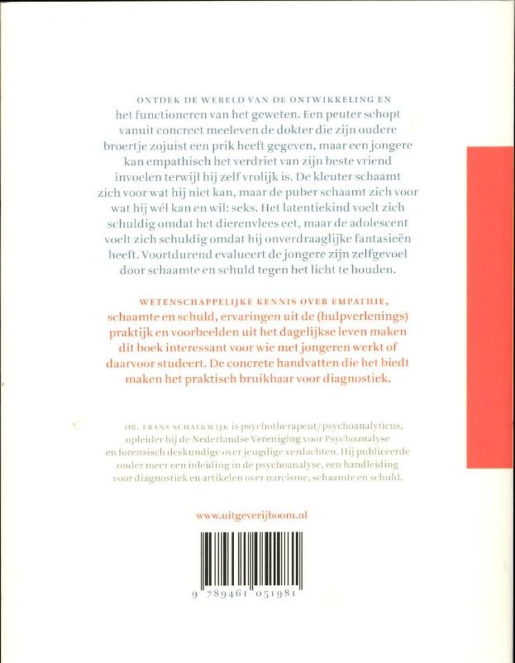 Ontdek de wereld van de ontwikkeling en het functioneren van het geweten. Een peuter schopt vanuit concreet meeleven de dokter die zijn oudere broertje zojuist een prik heeft gegeven, maar een jongere kan empatisch het verdriet van zijn beste vriend invoelen terwijl hij zelf vrolijk is. De kleuter schaamt zich voor wat hij niet kan, maar de puber schaamt zich voor wat hij wél kan en wil: seks. Het latentiekind voelt zich schuldig omdat het dierenvlees eet, maar de adolescent voelt zich schuldig omdat hij onverdraaglijke fantasieën heeft. Voortdurend evalueert de jongere zijn zelfgevoel door schaamte en schuld tegen het licht te houden.