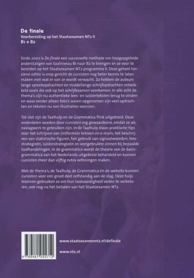 'De finale' is al sinds 2007 dé methode om je voor te bereiden op het Staatsexamen programma II. Er zijn meer middellange schrijfopdrachten en examentips en strategieën opgenomen. Verouderde teksten zijn vervangen en de bijbehorende site wordt vernieuwd. Verder bestaat ‘De finale’ natuurlijk uit het vertrouwde materiaal: veel oefeningen, praktijkvoorbeelden, examenopdrachten en duidelijke uitleg van