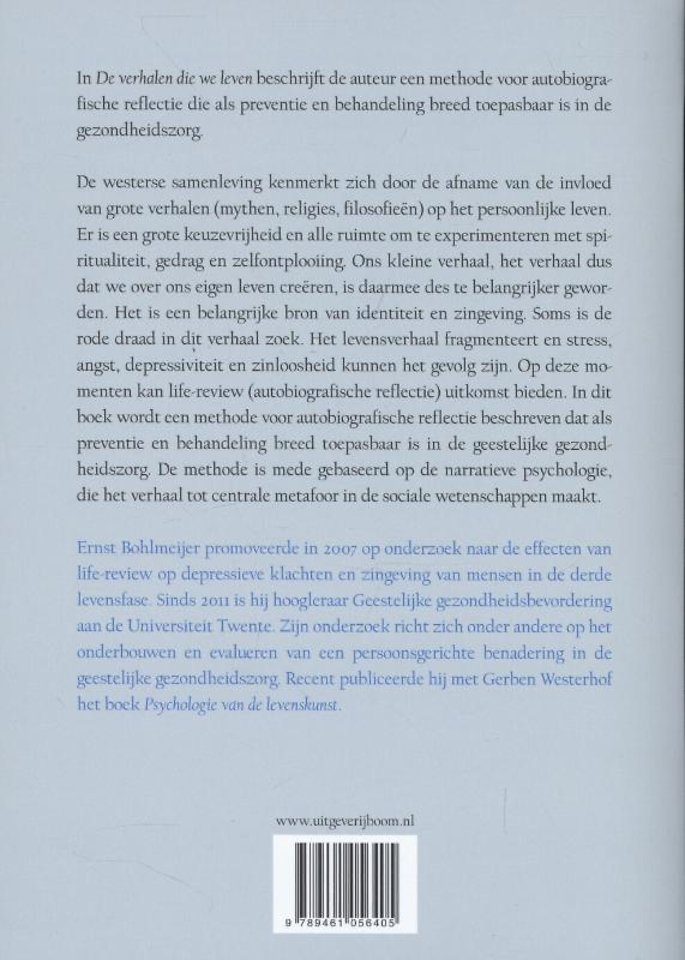 In De verhalen die we leven beschrijft de auteur een methode voor autobiografische reflectie die als preventie en behandeling breed toepasbaar is in de gezondheidszorg. De westerse samenleving kenmerkt zich door de afname van de invloed van grote verhalen (mythen, religies, filosofieën) op het persoonlijke leven. Er is een grote keuzevrijheid en alle ruimte om te experimenteren met spiritualiteit, gedrag en zelfontplooiing. Ons kleine verhaal, het verhaal dus dat we over ons eigen leven creëren, is daarmee des te belangrijker geworden. Het is een belangrijke bron van identiteit en zingeving. Soms is de rode draad in dit verhaal zoek. Het levensverhaal fragmenteert en stress, angst, depressiviteit en zinloosheid kunnen het gevolg zijn. Op deze momenten kan life-review (autobiografische reflectie) uitkomst bieden. In dit boek wordt een methode voor autobiografische reflectie beschreven dat als preventie en behandeling breed toepasbaar is in de geestelijke gezondheidszorg. De methode is mede gebaseerd op de narratieve psychologie, die het verhaal tot centrale metafoor in de sociale wetenschappen maakt.