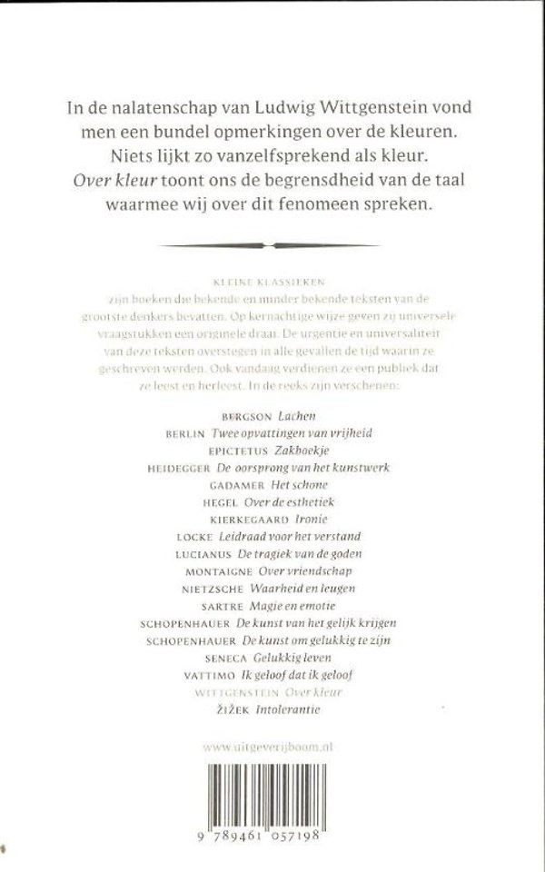 In de nalatenschap van Ludwig Wittgenstein (1889-1951) vond men een bundel opmerkingen over de kleuren. Met vele voorbeelden verheldert Over kleur de logica van onze kleurbegrippen. Niets lijkt zo vanzelfsprekend als kleur, maar Wittgenstein toont vooral de begrensdheid van de taal waarmee wij over dit fenomeen spreken.
