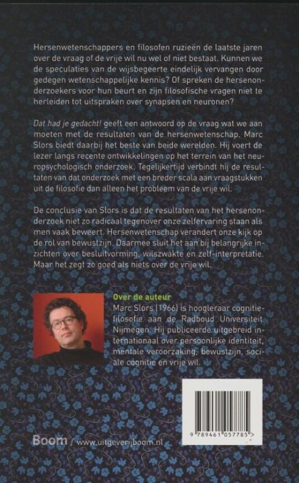 'Dat had je gedacht!' geeft een antwoord op de vraag wat we aan moeten met de resultaten van de hersenwetenschap. Marc Slors biedt daarbij het beste van beide werelden. Hij voert de lezer langs recente ontwikkelingen op het terrein van de neuronpsychologisch onderzoek. Tegelijkertijd verbindt hij de resultaten van dat onderzoek met een breder scala aan vraagstukken uit de filosofie dan alleen het probleem van de vrije wil.