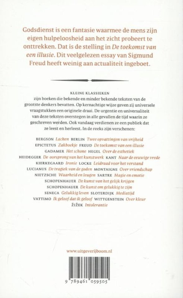 Godsdienst is volgens Sigmund Freud (1856-1939) een fantasie waarmee de mens zijn eigen hulpeloosheid aan het zicht probeert te onttrekken. Met De toekomst van een illusie verwoordde hij een diep cultuurfilosofisch inzicht, dat nog weinig aan actualiteit heeft ingeboet. Dit deel in de reeks Kleine klassieken verzamelt naast dit invloedrijke essay nog enkele andere boeiende beschouwingen van de grondlegger van de psychologie.