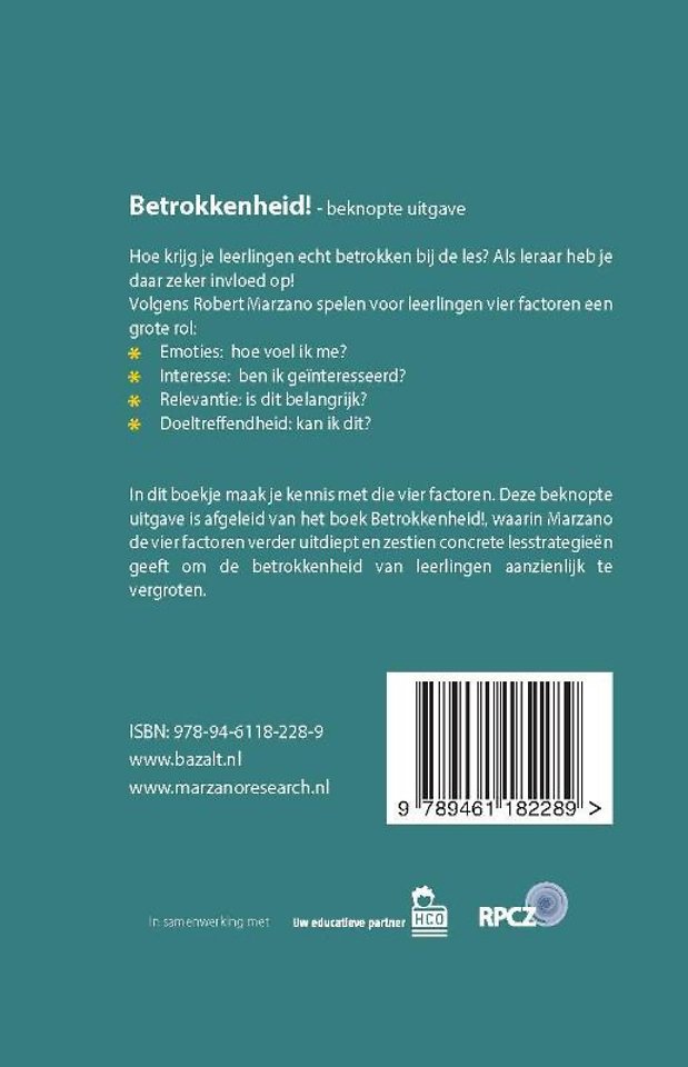 In dit boekje maak je kennis met deze vier factoren. De beknopte uitgave is afgeleid van het boek Betrokkenheid!, waarin Marzano de vier factoren verder uitdiept en zestien concrete lesstrategieën geeft om de betrokkenheid van leerlingen aanzienlijk te vergroten.