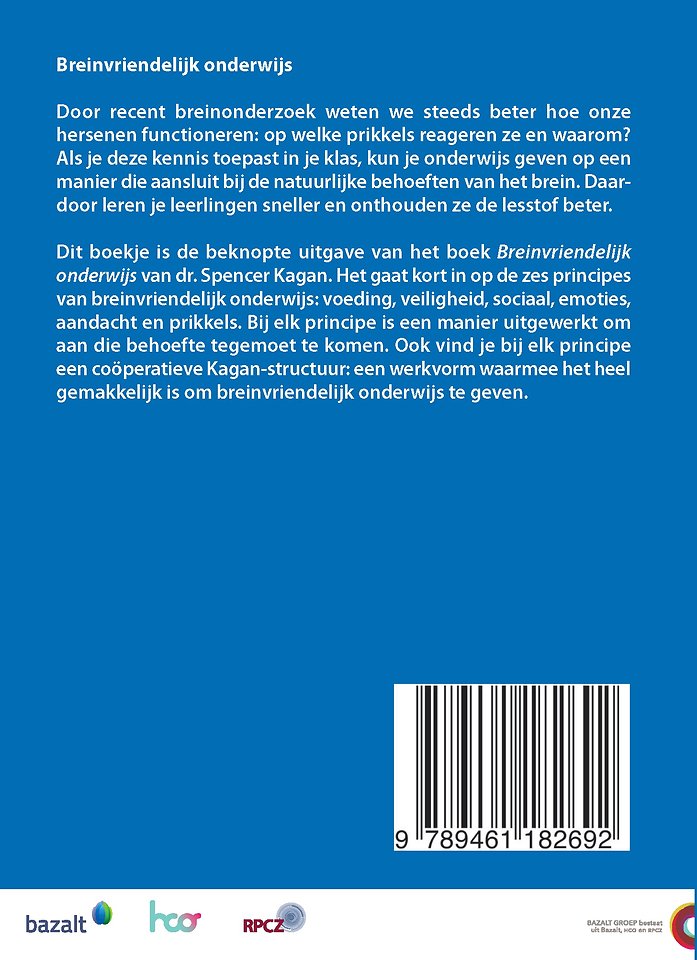 Dit boekje is de beknopte uitgave van het boek Breinvriendelijk onderwijs van dr. Spencer Kagan. Het gaat kort in op de zes principes van breinvriendelijk onderwijs: voeding, veiligheid, sociaal, emoties, aandacht en prikkels. Bij elk principe is een manier uitgewerkt om aan die behoefte tegemoet te komen. Ook vind je bij elk principe een coöperatieve Kagan-structuur: een werkvorm waarmee het heel gemakkelijk is om breinvriendelijk onderwijs te geven.