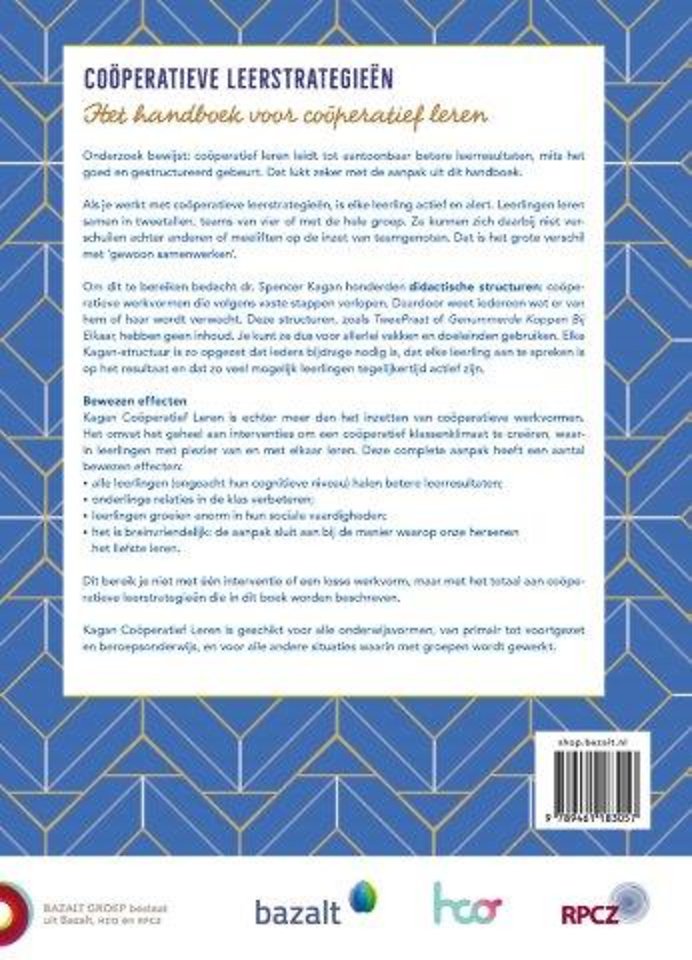 Dit effect ontstaat niet met één interventie of een losse werkvorm, maar met het totaal aan coöperatieve leerstrategieën die in dit boek worden beschreven. Kagan Coöperatief Leren is geschikt voor alle onderwijsvormen, van primair tot voortgezet en beroepsonderwijs, en voor alle andere situaties waarin met groepen wordt gewerkt. "
