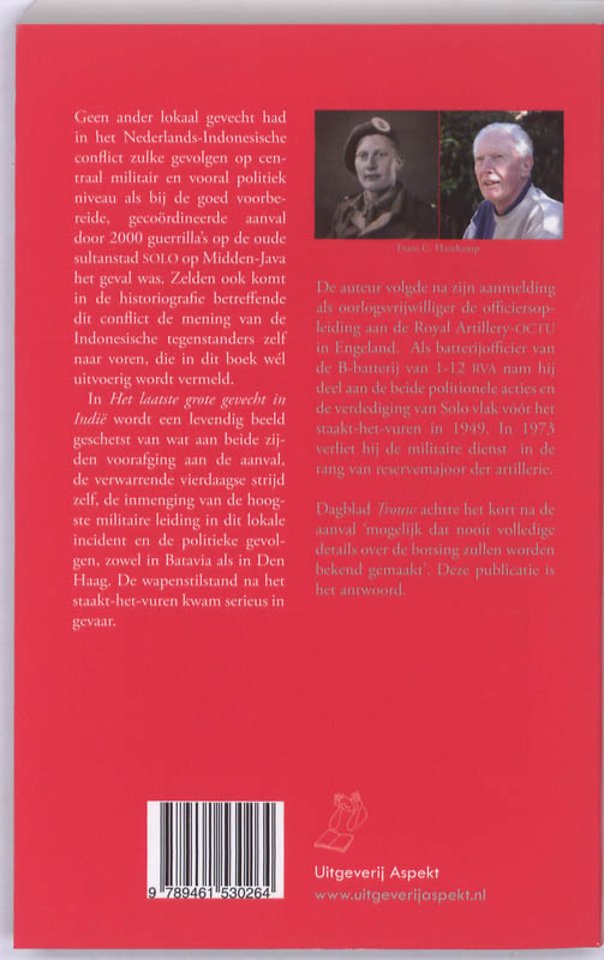 Geen ander lokaal gevecht had in het Nederlands-Indonesische conflict zulke gevolgen op centraal militair en vooral politiek niveau als bij de goed voorbereide, gecoördineerde aanval door 2000 guerrilla's op de oude sultanstad SOLO op Midden-Java het geval was. Zelden ook komt in de historiograffie betrefende dit conflict de mening van de Indonesische tegenstanders zelf naar voren, die in dit boek wél uitvoerig wordt vermeld. In Het laatste grote gevecht in Indië wordt een levendig beeld geschetst van wat aan beide zijden voorafging aan de aanval, de verwarrende vierdaagse strijd zelf, de inmenging van de hoogste militaire leiding in dit lokale incident en de politieke gevolgen, zowel in Batavia als in Den Haag. De wapenstilstand na het staakt-het-vuren kwam serieus in gevaar. De auteur volgde na zijn aanmelding als oorlogsvrijwilliger de offciersopleiding aan de Royal Artillery-OCTU in Engeland. Als batterijoffcier van de B-batterij van 1-12 RVA nam hij deel aan de beide politionele acties en de verdediging van Solo vlak vóór het