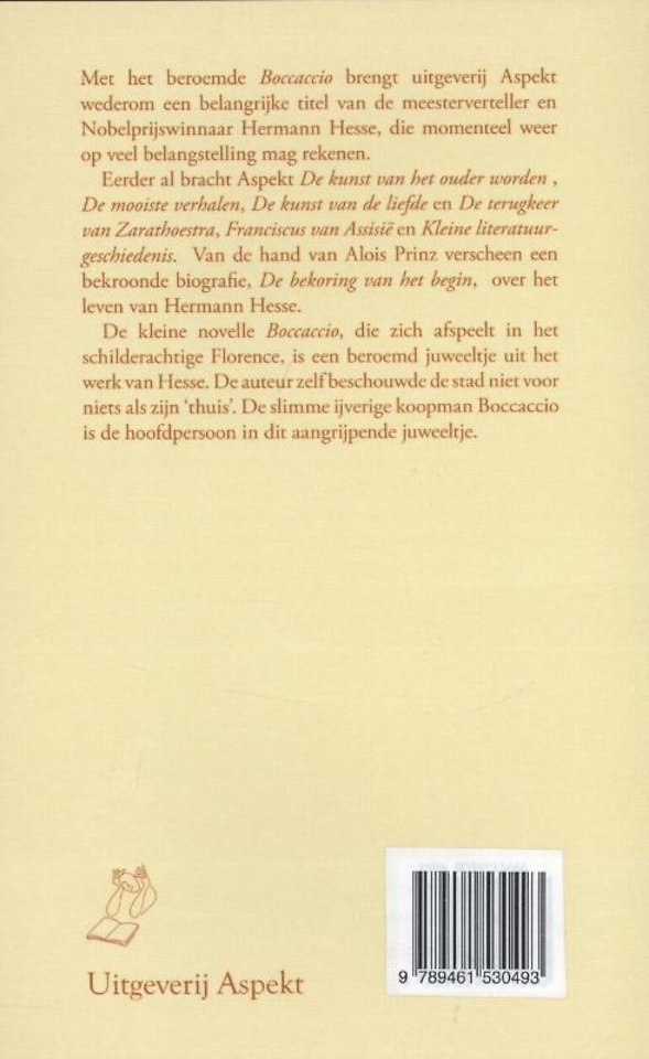 'Boccaccio' is een aangrijpend juweeltje uit het werk van Hesse. In de kleine novelle is de slimme, ijverige koopman Boccaccio de hoofdpersoon. Het verhaal speelt zich af in het schilderachtige Florence. Die stad beschouwde de auteur zelf niet voor niets als zijn 'thuis'.