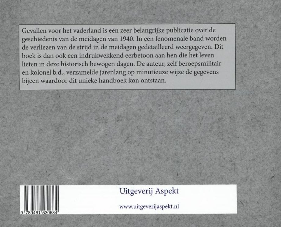 'Gevallen voor het vaderland' is een zeer belangrijke publicatie over de geschiedenis van de meidagen van 1940. In een fenomenale band worden de verliezen van de strijd in de meidagen gedetailleerd weergegeven. Dit boek is dan ook een indrukwekkend eerbetoon aan hen die het leven lieten in deze historisch bewogen dagen.
