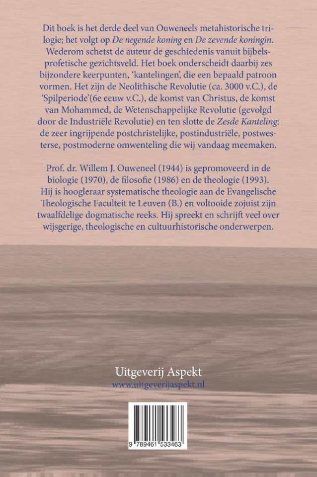 Dit boek is het derde deel van Ouweneels metahistorische trilogie; het volgt op De negende koning en De zevende koningin. Wederom schetst de auteur de geschiedenis vanuit bijbels- profetische gezichtsveld. Het boek onderscheidt daarbij zes bijzondere keerpunten, 'kantelingen', die een bepaald patroon vormen. Het zijn de Neolithische Revolutie (ca. 3000 v.C.), de 'Spilperiode'(6e eeuw v.C.), de komst van Christus, de komst van Mohammed, de Wetenschappelijke Revolutie (gevolgd door de Industriële Revolutie) en ten slotte de Zesde Kanteling: de zeer ingrijpende postchristelijke, postindustriële, postwesterse, postmoderne omwenteling die wij vandaag meemaken.