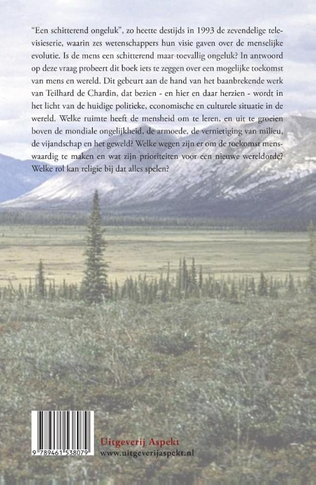 "Een schitterend ongeluk", zo heette destijds in 1993 de zevendelige televisieserie, waarin zes wetenschappers hun visie gaven over de menselijke evolutie. Is de mens een schitterend maar toevallig ongeluk? In antwoord op deze vraag probeert dit boek iets te zeggen over een mogelijke toekomst van mens en wereld. Dit gebeurt aan de hand van het baanbrekende werk van Teilhard de Chardin, dat bezien - en hier en daar herzien - wordt in het licht van de huidige politieke, economische en culturele situatie in de wereld. Welke ruimte heeft de mensheid om te leren, en uit te groeien boven de mondiale ongelijkheid, de armoede, de vernietiging van milieu, de vijandschap en het geweld. Welke wegen zijn er om de toekomst menswaardig te maken en wat zijn prioriteiten voor een nieuwe wereldorde? Welke rol kan religie bij dat alles spelen?
