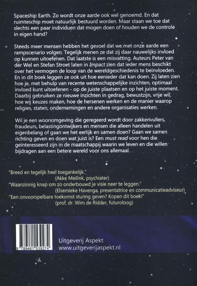 Steeds meer mensen hebben het gevoel dat we met onze aarde een rampscenario volgen. Tegelijk menen ze dat zij daar nauwelijks invloed op kunnen uitoefenen. Dat laatste is een misvatting. Auteurs Peter van der Wel en Stefan Stroet laten in Impact zien dat ieder mens beschikt over het vermogen de loop van de wereldgeschiedenis te beïnvloeden.