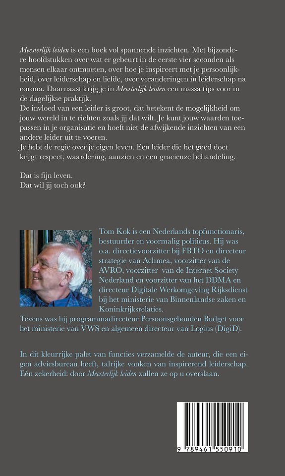 Tom Kok is een Nederlands topfunctionaris, bestuurder en voormalig politicus. Hij was o.a. directievoorzitter bij FBTO en directeur strategie van Achmea, voorzitter van de AVRO, voorzitter van de Internet Society Nederland en voorzitter van het DDMA en directeur Digitale Werkomgeving Rijksdienst bij het ministerie van Binnenlandse zaken en Koninkrijksrelaties. Tevens was hij programmadirecteur Persoonsgebonden Budget voor het ministerie van VWS en algemeen directeur van Logius (DigiD). In dit kleurrijke palet van functies verzamelde de auteur, die een eigen adviesbureau heeft, talrijke vonken van inspirerend leiderschap. Eén zekerheid: door Meesterlijk leiden zullen ze op u overslaan.