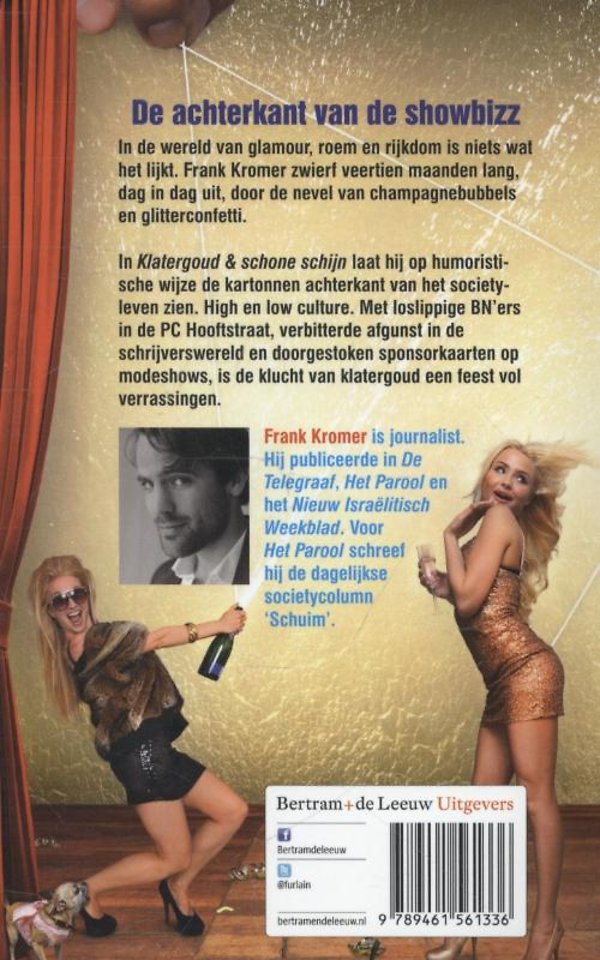 Van de rode loper van Joop van den Ende tot de borsten van Judith Osborn; in de wereld van glamour, roem en rijkdom is niets wat het lijkt. Journalist Frank Kromer zwierf veertien maanden lang dag in, dag uit door de nevel van champagnebubbels en glitterconfetti. In Klatergoud & schone schijn laat hij op humoristische wijze de kartonnen achterkant van het societyleven zien. Met loslippige BNers in de PC Hooftstraat, verbitterde afgunst in de schrijverswereld en doorgestoken sponsorkaarten op modeshows, is de klucht van klatergoud een feest vol verrassing.