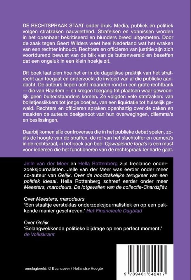 Daarbij komen alle controverses die in het publieke debat spelen, zoals de hoogte van de straffen, de rol van het slachtoffer en camera's in de rechtszaal, in het boek aan bod. 'Opwaaiende toga's' is een must voor iedereen die het functioneren van de rechtspraak ter harte gaat.