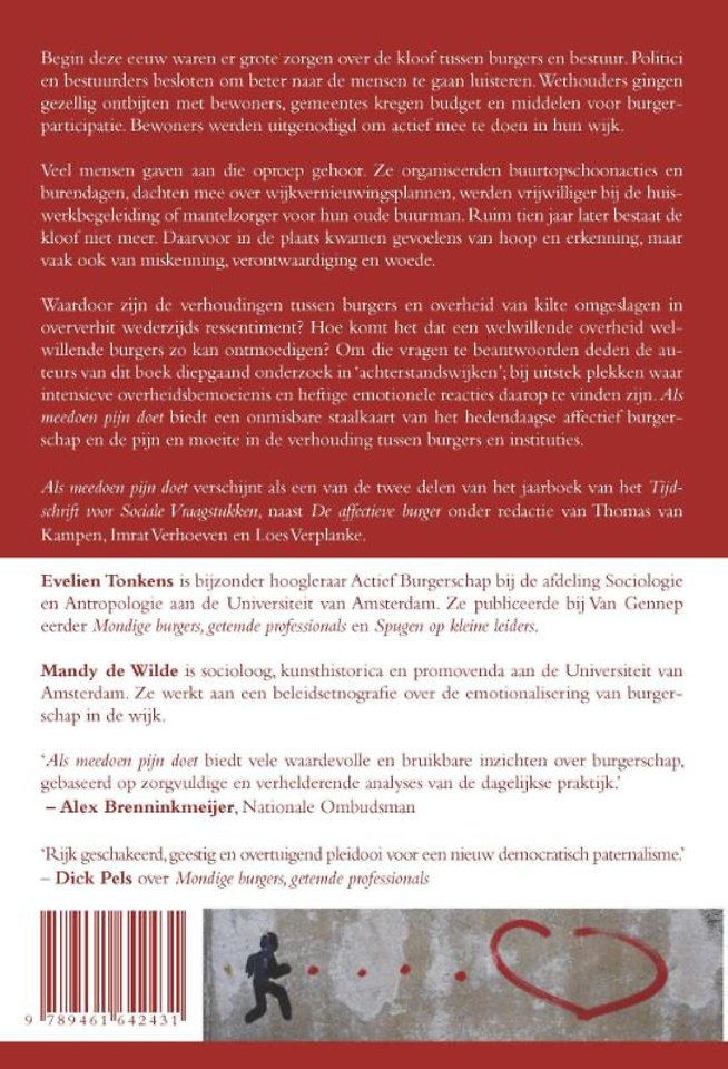 Waardoor zijn de verhoudingen tussen burgers en overheid van kilte omgeslagen in oververhit wederzijds ressentiment? Hoe komt het dat een welwillende overheid welwillende burgers zo kan ontmoedigen? Om die vragen te beantwoorden deden de auteurs van dit boek diepgaand onderzoek in 'achterstandswijken'; bij uitstek plekken waar intensieve overheidsbemoeienis en heftige emotionele reacties daarop te vinden zijn. "Als meedoen pijn doet" biedt een onmisbare staalkaart van het hedendaagse affectief burgerschap en de pijn en moeite in de verhouding tussen burgers en instituties.