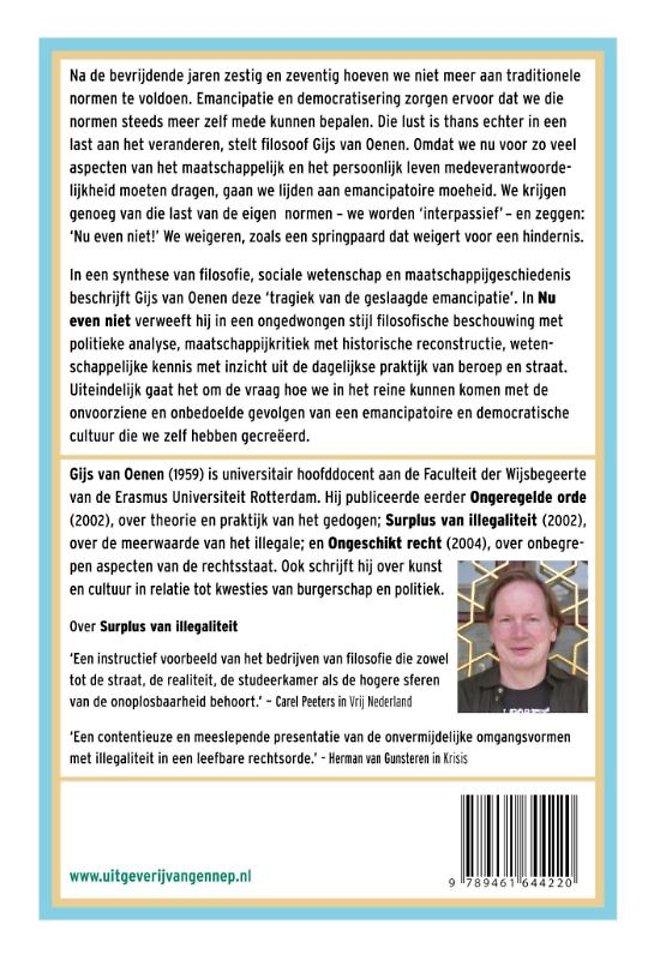In een synthese van filosofie, sociale wetenschap en maatschappijgeschiedenis beschrijft Gijs van Oenen deze 'tragiek van de geslaagde emancipatie'. In NU EVEN NIET verweeft hij in een ongedwongen stijl filosofische beschouwing met politieke analyse, maatschappijkritiek met historische reconstructie, wetenschappelijke kennis met inzicht uit de dagelijkse praktijk van beroep en straat. Uiteindelijk gaat het om de vraag hoe we in het reine kunnen komen met de onvoorziene en onbedoelde gevolgen van een emancipatoire en democratische cultuur die we zelf hebben gecreëerd.