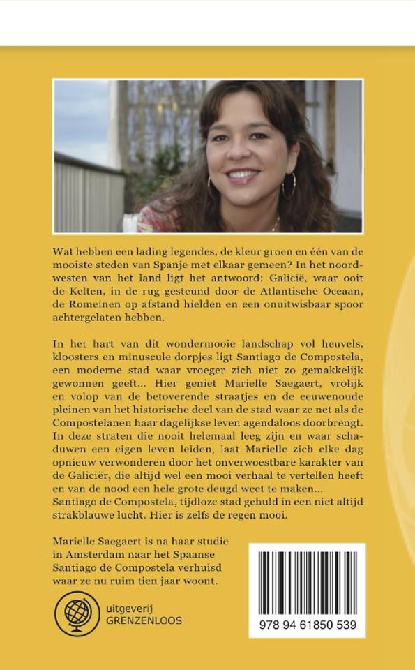 In het hart van dit wondermooie landschap vol heuvels, kloosters en minuscule dorpjes ligt Santiago de Compostela, een moderne stad waar vroeger zich niet zo gemakkelijk gewonnen geeft... Hier geniet Marielle Saegaert, vrolijk en volop van de betoverende straatjes en de eeuwenoude pleinen van het historische deel van de stad waar ze net als de Compostelanen haar dagelijkse leven agendaloos doorbrengt. In deze straten die nooit helemaal leeg zijn en waar schaduwen een eigen leven leiden, laat Marielle zich elke dag opnieuw verwonderen door het onverwoestbare karakter van de Galicier, die altijd wel een mooi verhaal te vertellen heeft en van de nood een hele grote deugd weet te maken... Santiago de Compostela, tijdloze stad gehuld in een niet altijd strakblauwe lucht. Hier is zelfs de regen mooi.