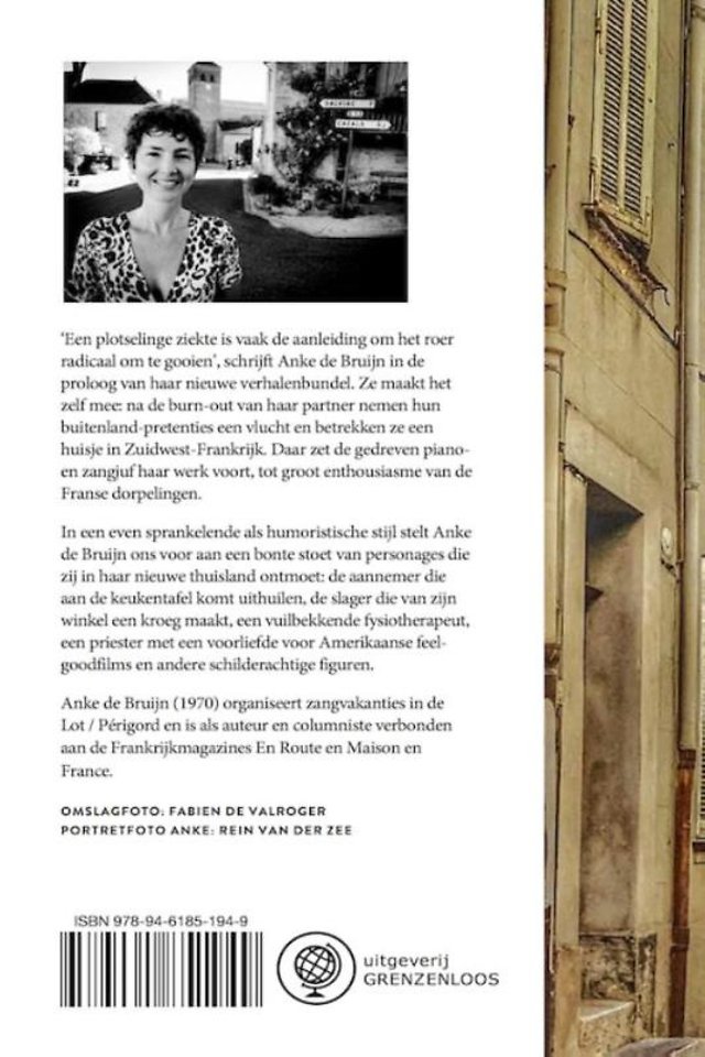 'Een plotselinge ziekte is vaak de aanleiding om het roer radicaal om te gooien', schrijft Anke de Bruijn in de proloog van haar nieuwe verhalenbundel. Ze maakt het zelf mee: na de burn-out van haar partner nemen hun buitenland-pretenties een vlucht en betrekken ze een huisje in Zuidwest-Frankrijk. Daar zet de gedreven piano- en zangjuf haar werk voort, tot groot enthousiasme van de Franse dorpelingen.