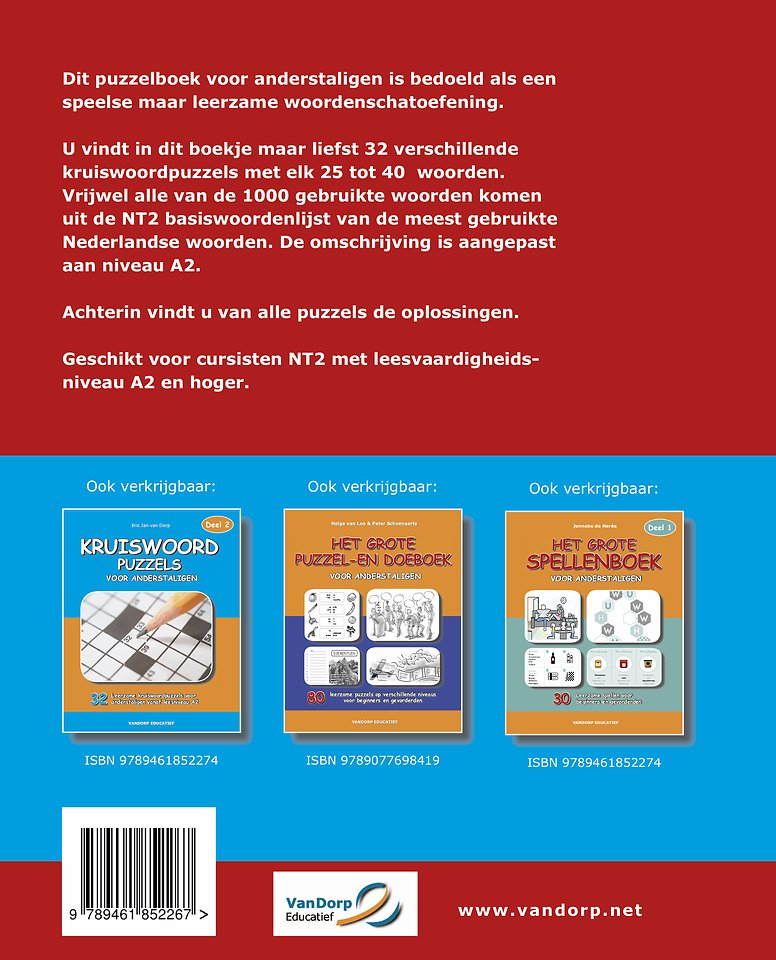 U vindt in dit boekje maar liefst 32 verschillende kruiswoordpuzzels met elk 25 tot 40 woorden. Vrijwel alle van de 1000 gebruikte woorden komen uit de NT2 basiswoordenlijst van de meest gebruikte Nederlandse woorden. De omschrijving is aangepast aan niveau A2.