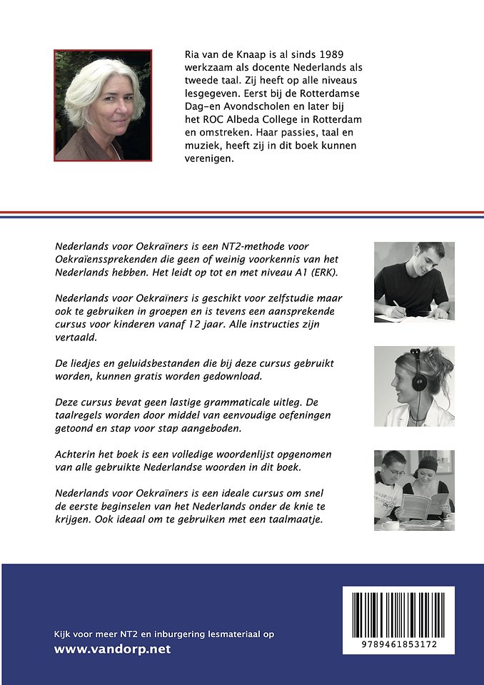 Ria van de Knaap is al sinds 1989 werkzaam als docente Nederlands als tweede taal. Zij heeft op alle niveaus lesgegeven. Eerst bij de Rotterdamse Dag-en Avondscholen en later bij het ROC Albeda College in Rotterdam en omstreken. Haar passies, taal en muziek, heeft zij in dit boek kunnen verenigen. De door haar ontwikkelde methode krijgt al jaren veel lof.