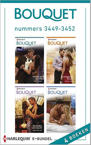 Kiest u voor gemak? Met deze bundel heeft u vier van de acht Bouquet-romans (nummers 3449 t/m 3452 van de maand in handen. Zo kunt u lekker doorlezen en nog gemakkelijker genieten van uw favoriete reeks! (1) WRAAK EN PASSIE van ABBY GREEN (Eén nacht in...) - Ooit zag Madalena zich gedwongen Nicolás te verlaten, maar nu heeft ze hem nodig. Aan zijn hulp zit echter een onverwacht prijskaartje (2) ONMOGELIJKE DROOM van JULIA JAMES - Marisa kan niet geloven dat de knappe Griekse Aram Teodarkis voor háár valt. Maar wat zal hij doen als hij haar grote geheim ontdekt? (3) VERBODEN HARTSTOCHT van DANI COLLINS - Rowan is ervan overtuigd dat Richard een hekel aan haar heeft. Wat ze niet weet, is dat minachting niet het enige is wat ze in hem oproept (4) ARGENTIJNSE KUSSEN van SUSAN STEPHENS (De Acosta's) - Grace is dolblij wanneer ze in Argentinië een wijnhuis mag bezoeken. Tot ze ontdekt wie de eigenaar is