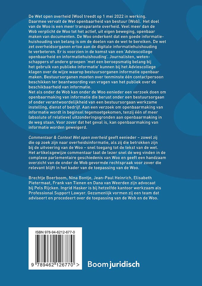 Dit boek geeft eenieder – zowel zij die op zoek zijn naar overheidsinformatie, als zij die betrokken zijn bij de uitvoering van de Woo – snel toegang tot de tekst van de wet. Het artikelsgewijze commentaar laat de lezer snel de weg vinden in de complexe parlementaire geschiedenis van Woo en geeft een handzaam overzicht van de onder de Wob gevormde rechtspraak voor zover die relevant blijft in het kader van de toepassing van de Woo.