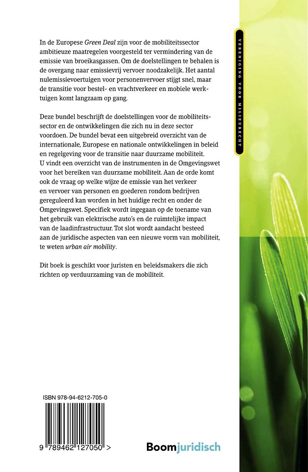 duurzame mobiliteit emissievrij vervoer milieurecht zero-emissiemobiliteit omgevingswet juridische aspecten elektrische auto's transitie laadinfrastructuur milieu bestuursrecht regulering broeikasgasemissies goederenvervoer personenvervoer urban air mobility wetgeving europese green deal nulemissievoertuigen privaatrecht ruimtelijke impact