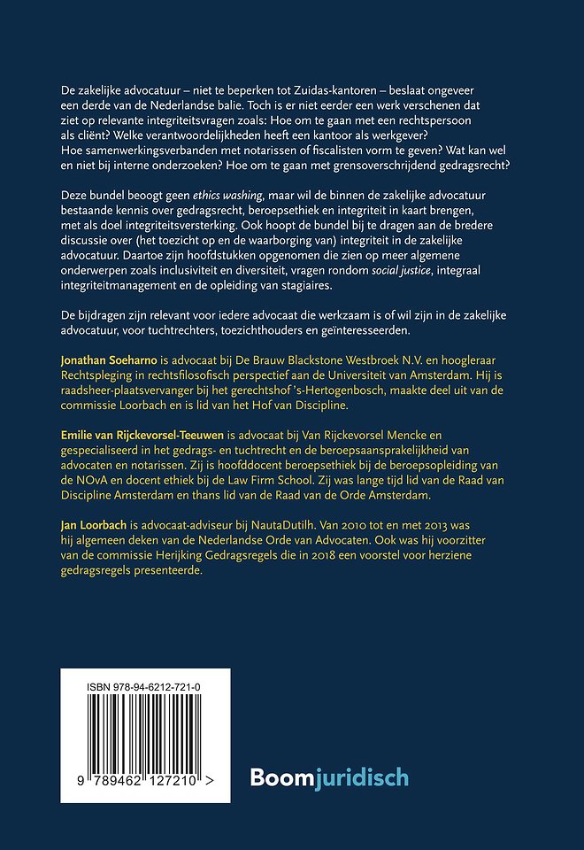 De zakelijke advocatuur – niet te beperken tot Zuidas-kantoren – beslaat ongeveer een derde van de Nederlandse balie. Toch is er niet eerder een werk verschenen dat ziet op relevante integriteitsvragen zoals: Hoe om te gaan met een rechtspersoon als cliënt? Welke verantwoordelijkheden heeft een kantoor als werkgever? Hoe samenwerkingsverbanden met notarissen of fiscalisten vorm te geven? Wat kan wel en niet bij interne onderzoeken? Hoe om te gaan met grensoverschrijdend gedragsrecht?