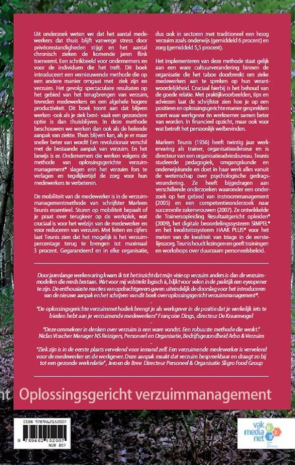 Dit boek toont aan dat blijven werken - ook als je ziek bent - vaak een gezondere optie is dan thuisblijven. In deze methode beschouwt men werken dan ook als helende aanpak van ziekte. Thuis blijven kan, als je er maar sneller beter van wordt! Ondernemers die werken volgens de methode van oplossingsgericht verzuimmanagement slagen erin het verzuim fors te verlagen en tegelijkertijd de zorg voor hun medewerkers te verbeteren.