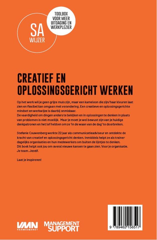 Stefanie Couwenberg werkte 22 jaar als communicatieadviseur en ontdekte de kracht van creatief en oplossingsgericht denken. Inmiddels helpt ze als trainer dagelijks organisaties en hun medewerkers om buiten de lijntjes te denken. Dit boek helpt ook jou om overal nieuwe kansen te gaan zien. Voor je organisatie. Je team. Jezelf.